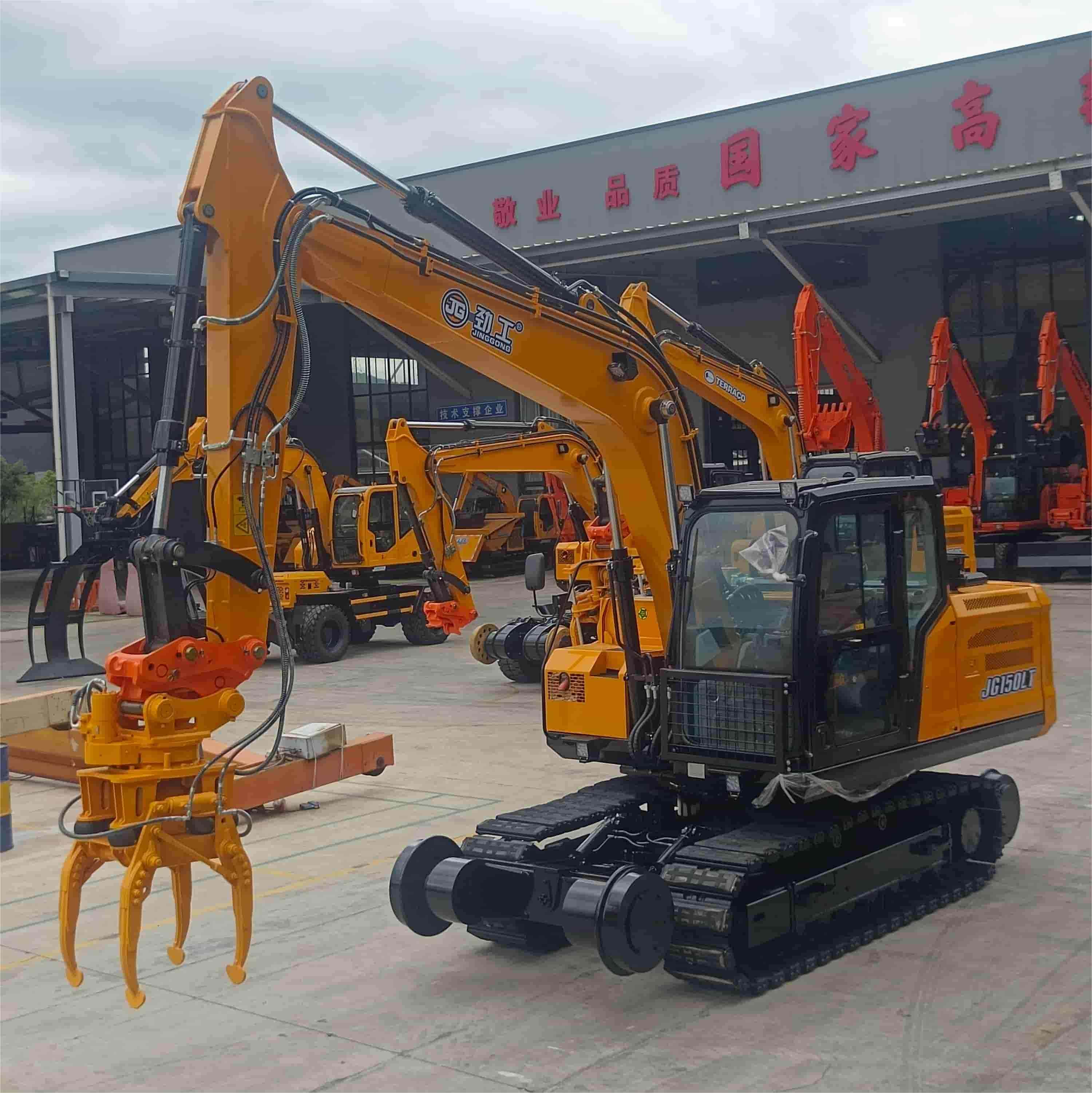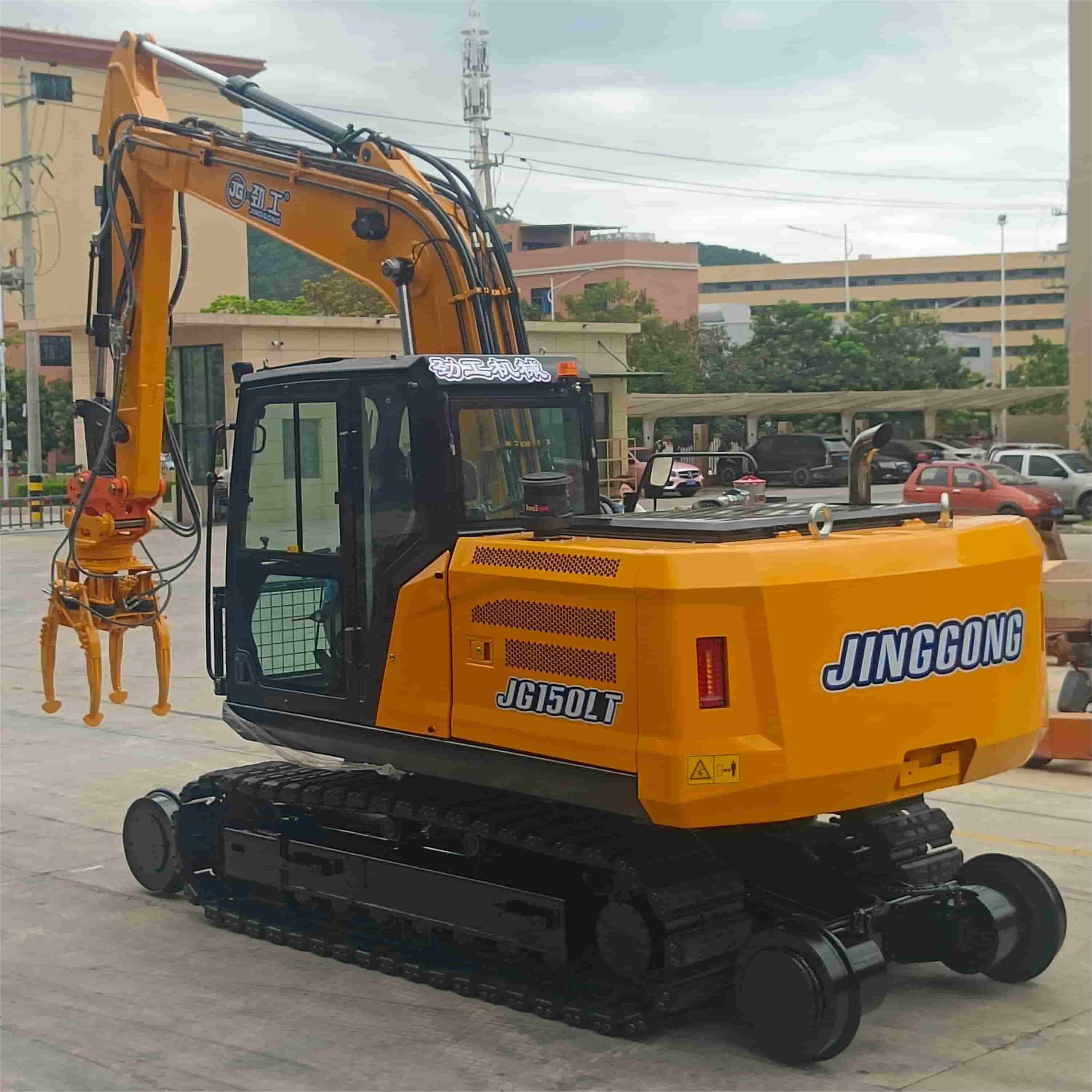 Железнодорожный экскаватор JG150LT грузоподъемностью 15 тонн. Вся машина оснащена всепогодной системой освещения и адаптивным для различных типов местности гусеницами, подходит для работы в тоннелях, на мостах, поворотах и в других сложных условиях. Соответствует стандартам безопасности железнодорожной техники EN 14033, подходит для ежедневного технического обслуживания и капитального ремонта высокоскоростных железных дорог, городского железнодорожного транспорта и железных дорог с тяжелыми грузами. Является ключевым оборудованием, отличающимся универсальностью и надежностью в современной системе эксплуатации и технического обслуживания железных дорог.